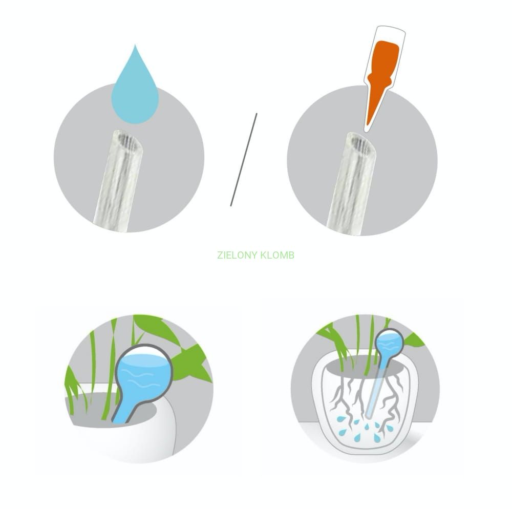 Po napełnieniu wodą lub odżywką, nawadniacz należy wbić w podłoże, a roślina sama będzie pobierać odpowiednią ilość płynu.