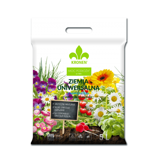 Ziemia uniwersalna KRONEN® z nawilżaczem i nawozem jest przeznaczona do sadzenia i przesadzania wielu gatunków roślin zielonych i kwitnących, warzyw, ziół, bylin, iglaków w domach na balkonach, tarasach i w ogrodach, z wyjątkiem roślin kwaśnolubnych. Ziemia uniwersalna to wysokowartościowe, naturalne podłoże wyprodukowane na bazie torfu wysokiego o różnym stopniu rozkładu w oparciu o recepturę i doświadczenie profesjonalnych ogrodników. Ziemia uniwersalna zawiera nawilżacz i nawóz wieloskładnikowy z mikroelementami.